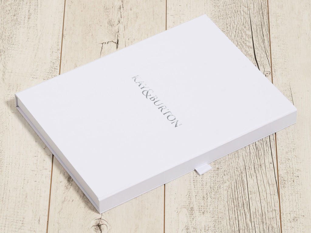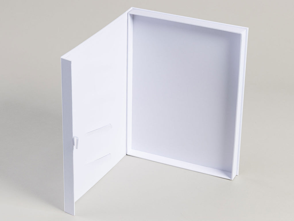 A premium, low height rigid document box to fit A4 sized items, featuring two business card slots on the inside lid. Made in an FSC accredited factory from the highest quality sustainably sourced materials. Bright white interior and exterior with a luxe soft-touch finish. Opens on the long edge (like a book). Fastened with magnets and super strong 3M adhesive tabs. Simply pops up from flat-pack, no manual assemblage required. Available in cartons of 10 units only. Not for individual sale. As we are trademarked, all our boxes feature a very small logo on the base.