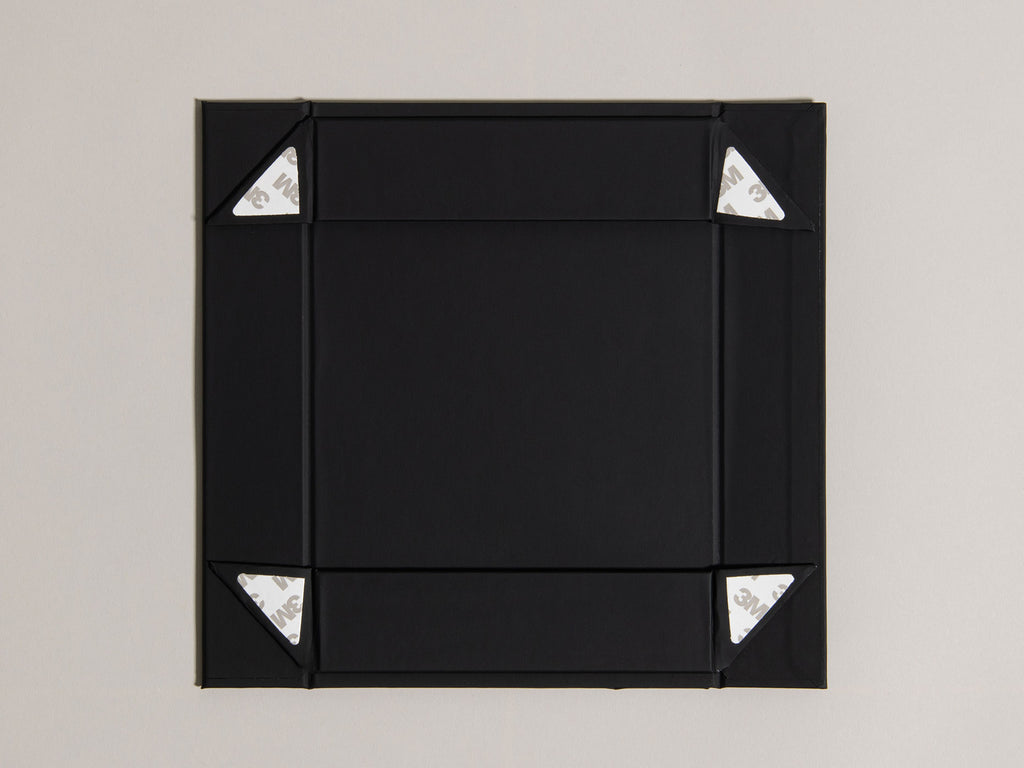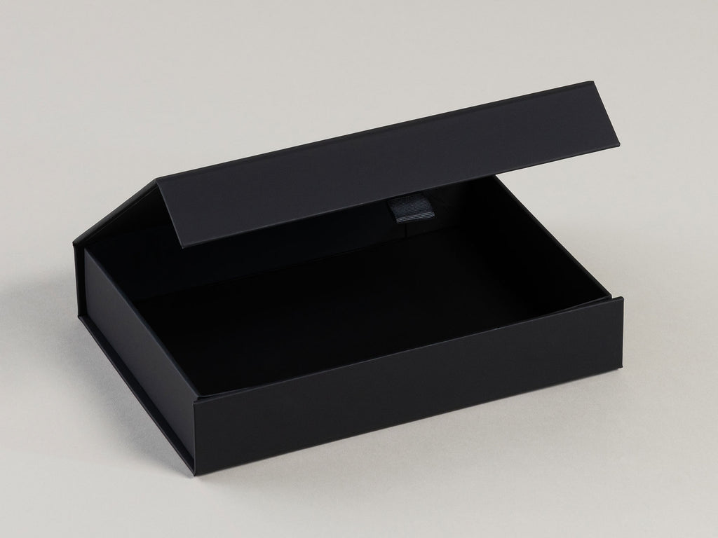 A rigid flatpack gift box to fit A5 sized items, made in an FSC accredited factory from the highest quality sustainably sourced materials. Rich black interior and exterior with a luxe soft-touch finish. Opens on the long edge (like a book). Fastened with magnets and super strong 3M adhesive tabs. Simply pops up from flat-pack, no manual assemblage required. Available in cartons of 20 units only. Not for individual sale. As we are trademarked, all our boxes feature a very small logo on the base.