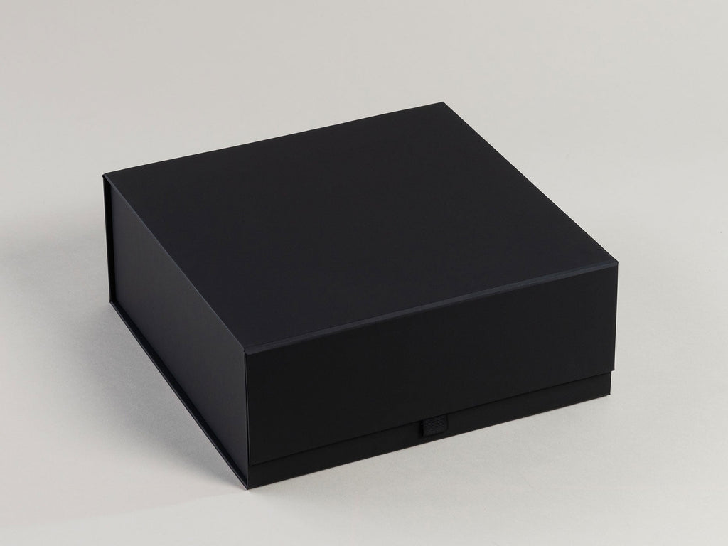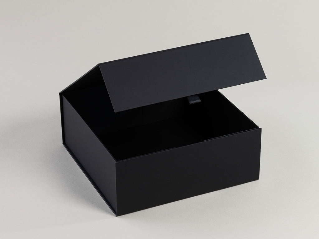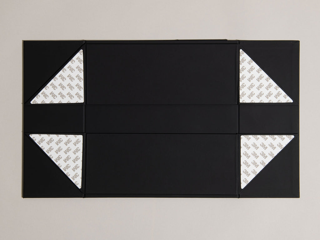 A rigid flat pack hamper gift box made in an FSC accredited factory from the highest quality sustainably sourced materials. Rich black interior and exterior. Super luxe soft-touch finish inside and out. Fastened internally with four super strong 3M adhesive tabs and a magnetic front flap with a high quality grosgrain ribbon pull-tab. Simply pops up from flat-pack, no manual assemblage required. Available in cartons of 10 units only. Not for individual sale. As we are trademarked, all our boxes feature a very small transparent logo on the base.