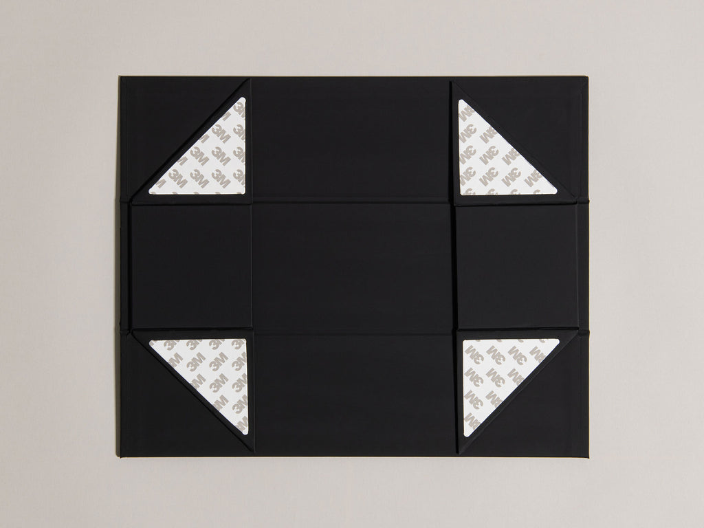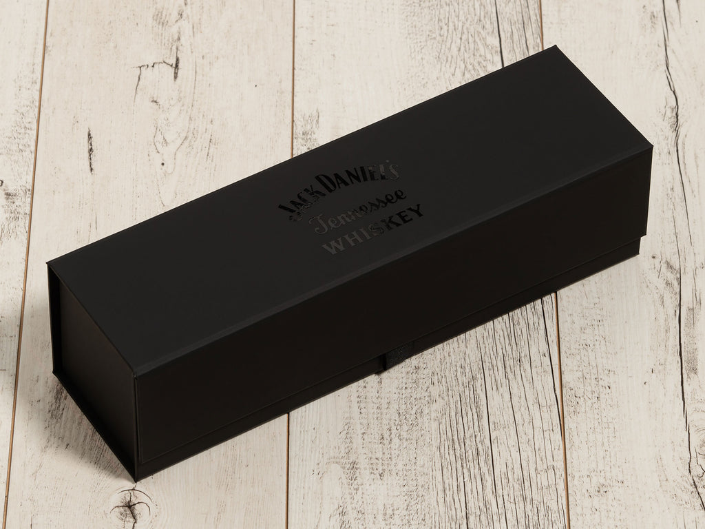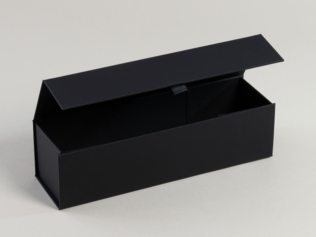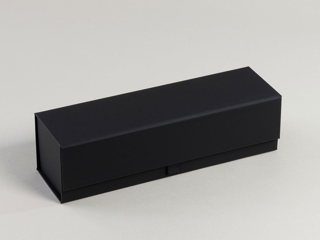 A rigid flatpack gift box to fit one 750ml wine bottle, made in an FSC accredited factory from the highest quality sustainably sourced materials. Rich black interior and exterior with a luxe soft-touch finish. Opens on the long edge (like a book). Fastened with magnets and super strong 3M adhesive tabs. Simply pops up from flat-pack, no manual assemblage required. Available in cartons of 10 units only. Not for individual sale. As we are trademarked, all our boxes feature a very small logo on the base.